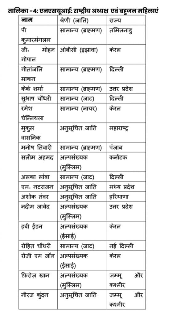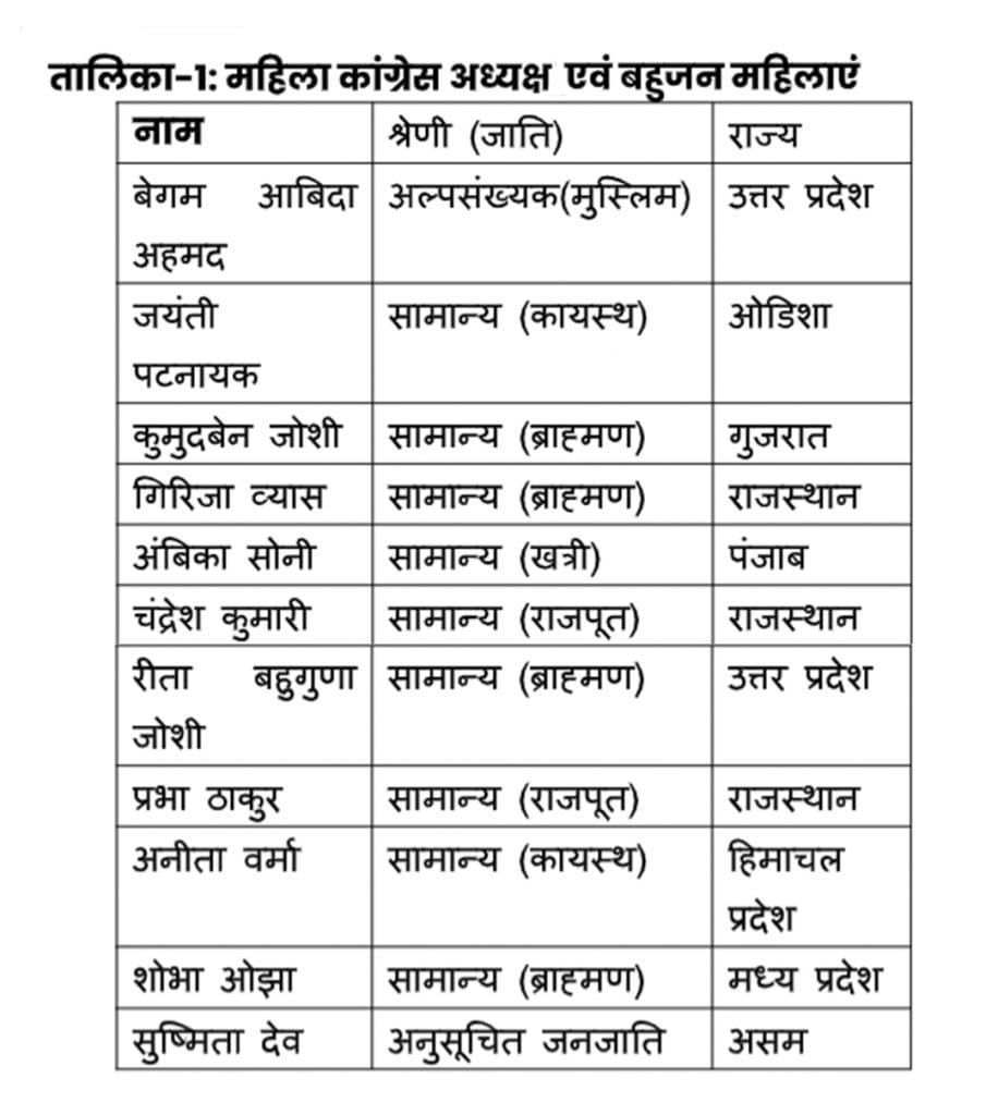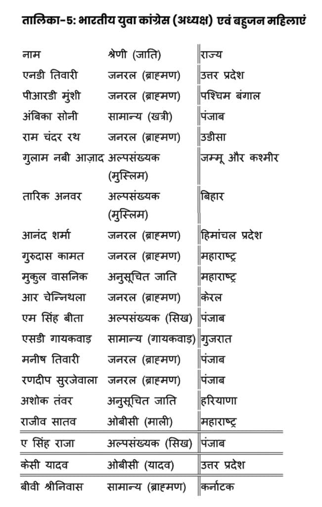 पिछड़ा वर्ग (OBCs) का प्रतिनिधित्व पार्टी के ‘महिला मोर्चा’ और ‘युवा विंग’ में भी ना के बराबर होना यह दर्शाता है कि कांग्रेस आज भी पिछड़े वर्ग के समुचित प्रतिनिधित्व को लेकर बहुत गंभीर नही है. यहां यह सवाल उठना भी लाजमी है कि क्या कांग्रेस को पिछड़े वर्ग से आने वाली एक भी महिला में कोई काबिलियत नहीं दिखी तथा आज़ादी के कई दशक बीत जाने के बाद भी अब तक ‘महिला मोर्चा’ अध्यक्ष पद के लिए कोई पिछड़े वर्ग का प्रतिनिधित्व करने वाली एक भी महिला नहीं मिली ? उपरोक्त तथ्यों को जिसे नीचे दी गई तालिका के माध्यम से स्पष्ट तरीके से समझा जा सकता है.