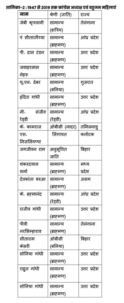 इसी क्रम में यदि हम अब तक चुने गए कांग्रेस अध्यक्ष की सामाजिक पृष्ठभूमि का अवलोकन करें तो हमें ज्यादातर चुने गए अध्यक्ष ब्राह्मण समुदाय से देखने को मिलते हैं. पिछड़ी जाति की भागीदारी का सवाल शायद कभी कांग्रेस अलाकमानों के मानसपटल पर आया ही नही. इस संदर्भ में यह कहना उचित होगा, ‘उन्हें कुछ तो मजबूरियां रही होंगी, वर्ना यूं ही कोई बेवफा नही होता .’