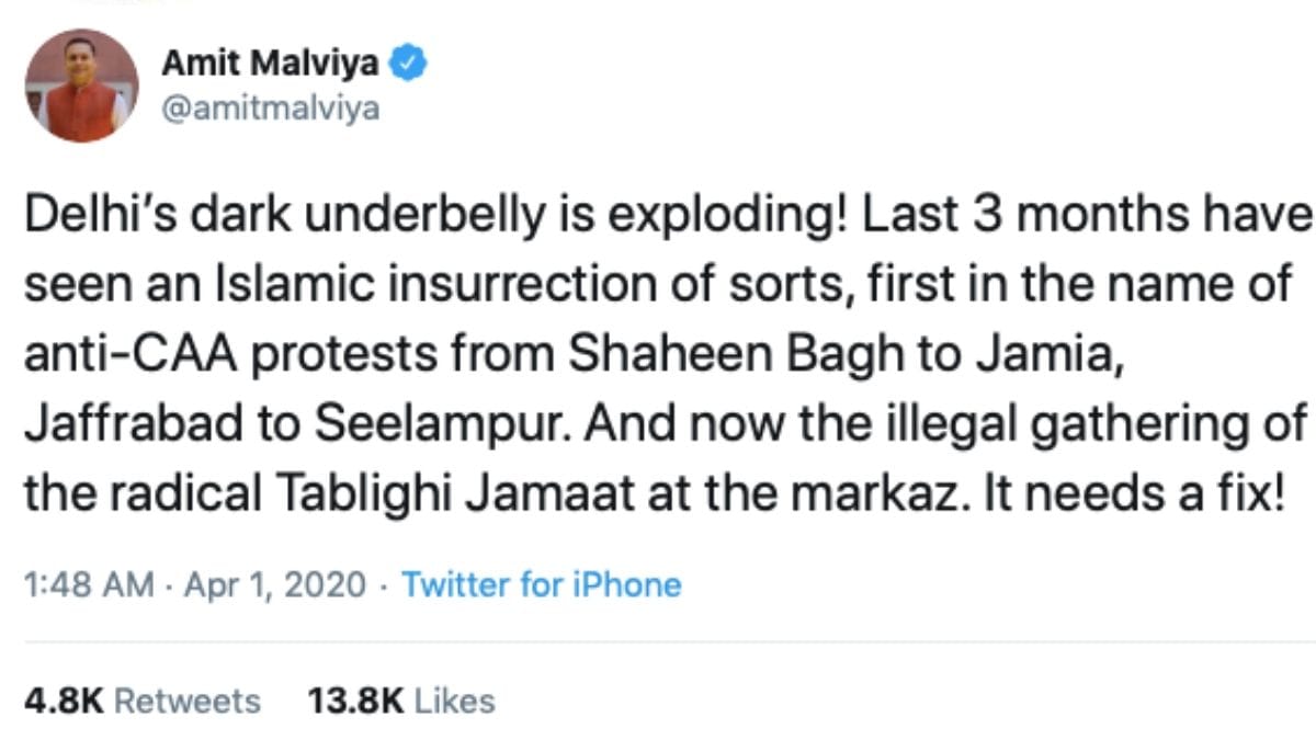भाजपा के आईटी सेल हेड अमित मालवीय की ही बात करें तो उनके ट्वीट्स हास्यास्पद और हैरतअंगेज हैं. वो हर रोज दो-तीन फेक खबरें फैलाते हैं और चार अन्य वेबसाइट्स के रिसोर्सेज उन फेक खबरों का खंडन करने में चले जाते हैं. मालवीय की ट्विटर टाइमलाइन पर कोरोना महामारी से जुड़ी गंभीर बातें कम हैं.