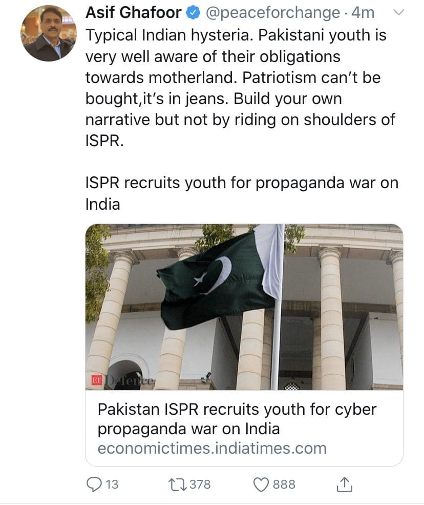 पाकिस्तानी दोस्तों, आज जब आप स्वयं ही #TributeToAsifGhafoor और #सलामआसिफ़गफ़ूर को ट्विटर पर ट्रेंड करा रहे हैं, मैं आपके उन रिश्तेदारों और उनके रिश्तेदारों और उनके पड़ोसियों से माफी चाहूंगा कि मैंने उनको व्यक्तिगत तौर पर जवाब नहीं दे सका. आप जानते हैं कि इसकी वजह घमंड नहीं, बल्कि समय का अभाव है.