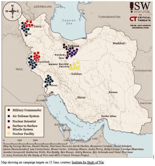इजरायल ने 13 जून की सुबह 5.30 बजे (ईरान के समय के अनुसार 3.30 बजे) से पहले से ही हवाई हमले शुरू कर दिए. उसने ईरान के परमाणु कार्यक्रमों, सेना और विज्ञान क्षेत्र के नेतृत्व जमात, हवाई सुरक्षा इंतज़ामों, बैलिस्टिक मिसाइल इन्फ्रास्ट्रक्चर, और दूसरे सैन्य ठिकानों को निशाना बनाया. यह 1500 किमी दूर से हवाई ताकत का हैरतअंगेज़ प्रदर्शन था जिसमें 100 ठिकानों को निशाना बनाने के लिए 200 विमानों को तैनात किया गया था, 330 हथियारों का इस्तेमाल किया गया था. अपना कोई नुकसान किए बिना.