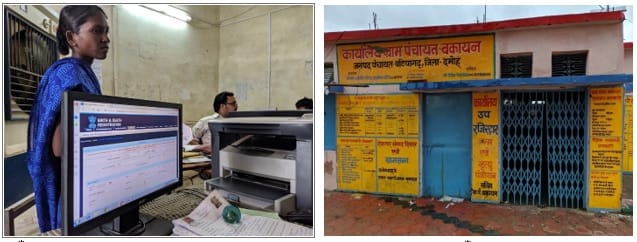 बाएं: एक महिला पंचायत-कार्यालय से मृत्यु प्रमाणपत्र के लिए इंतज़ार कर रही है. दाएं: पंचायत-कार्यालय की ओर से घोषणा की जाती है कि यह जन्म और मृत्यु का उप-पंजीयक कार्यालय भी है.