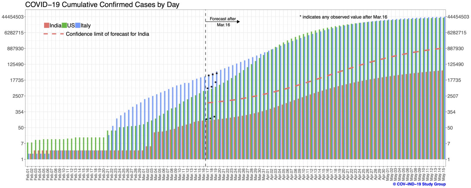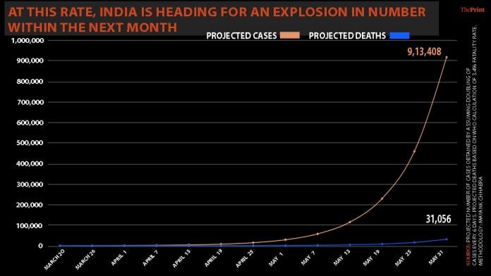 भारत में जिस रफ्तार से इसके मामले बढ़ रहे हैं उसे और विश्व स्वास्थ्य संगठन (डब्लूएचओ) के मुताबिक पक्के मामलों में मौत की 3.4 प्रतिशत की दर को देखते हुए भारत में मई के अंत तक इसके 10 लाख से ज्यादा पक्के मामले सामने आ सकते हैं और 30,000 से ज्यादा लोग मारे जा सकते हैं. ये मोटे अनुमान हैं. बायो-स्टैटीस्टीसियनों की एक टीम ने अनुमान लगाया है कि ये आंकड़े और ऊंचे भी हो सकते हैं और 10 लाख मामले 15 मई तक ही सामने आ सकते हैं.