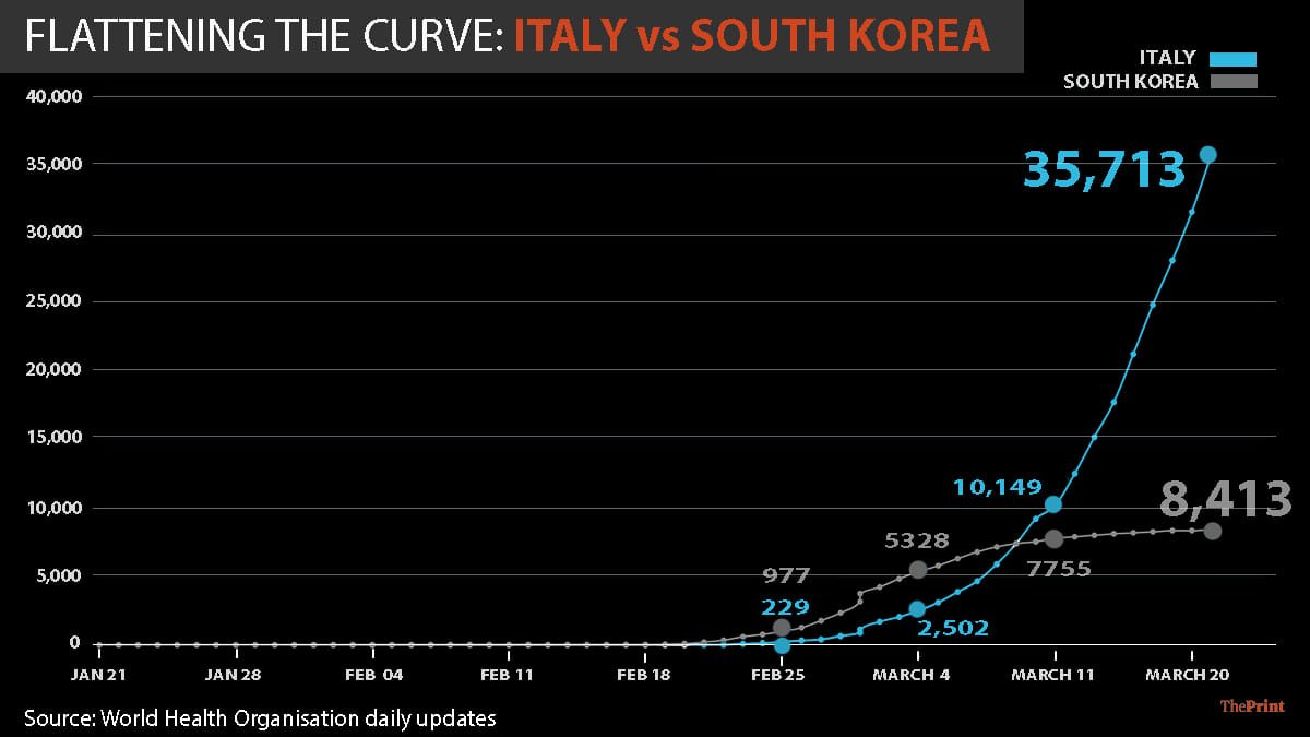 इटली में पहला मामला दक्षिण कोरिया में सामने आए पहले मामले के दस दिन बाद सामने आया था. इसके अगले 10 दिनों में इटली में 10 से भी कम मामले थे, जबकि दक्षिण कोरिया में गिनती लगातार बढ़ रही थी. लेकिन बस एक भयावह सप्ताह में इटली में मामलों में 100 गुना वृद्धि हो गई. इसके बाद के एक सप्ताह में दक्षिण कोरिया ने तो इसकी रफ्तार को तोड़ दिया, मगर इटली में मामले रॉकेट की रफ्तार से बढ़ रहे हैं और उसकी स्वास्थ्य सेवाएं पूरी तरह विफल साबित हो रही हैं. भारत को इटली वाली रफ्तार हासिल करने से बचना होगा और यह काम तेजी से करना होगा. इसके लिए लोगों को इकट्ठा होने से रोकने के उपायों को, जिनकी घोषणा उसने कर भी दी है और भी कड़ाई से लागू करना होगा, भले ही सख्त लॉकडाउन से बचना पड़े.