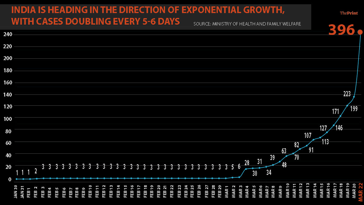 भारत में कोरोना के पहले मामलों को 50 के आंकड़े पर पहुंचने में 40 दिन लगे, 100 के आंकड़े को छूने में और पांच दिन लगे, इसके तीन दिन के भीतर यह आंकड़ा 150 का हो गया और महज दो और दिनों में 200 का आंकड़ा पहुंच गया. अब इसके बाद इसका पहिया और तेजी से घूमने वाला है. पक्के मामलों की संख्या पांच या उससे भी कम दिनों में दोगुनी हो रही है, जबकि इस महीने के शुरू में ऐसा होने में छह दिन लग रहे थे. इस तरह भारत में भी इसकी रफ्तार दुनिया के दूसरे देशों में जो रफ्तार है उसके बराबर हो गई है, अमेरिका में मामले हर दो दिन पर दोगुनी रफ्तार से बढ़ रहे हैं.