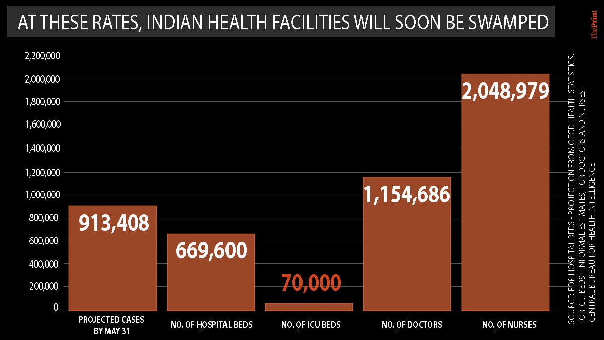 2017 में भारत में प्रति 1000 आबादी पर अस्पताल के मात्र 0.5 बिस्तर उपलब्ध थे. जाहिर है, आगामी महीनों में भारत की स्वास्थ्य सेवाओं के मौजूदा ढांचे पर भारी बोझ पड़ सकता है. कोरोना के पक्के मामलों की संख्या जिस दर से बढ़ रही है उसके चलते जून आने तक भारत में अस्पतालों में बिस्तर खाली नहीं मिलेंगे. छाबड़ा का कहना है कि बिस्तरों की जो उपलब्धता है और मामलों की संख्या जिस दर से दोगुनी हो रही है उसे देखते हुए लगता है कि भारत में अप्रैल में ही सारे बिस्तर भर जाएंगे. यहां गंभीर मामलों के लिए बिस्तरों और वेंटिलेटरों की अधिकृत संख्या उपलब्ध नहीं है मगर माना जाता है कि इनकी भारी कमी है. अनुमान है कि देश भर में आइसीयू के 70,000 बिस्तर हैं. अगर मई के अंत तक, प्रति 10 में से एक मामले के लिए आइसीयू बिस्तर की जरूरत पड़ी तो भारत में पहले नहीं तो तब तक ऐसे सारे बिस्तर भर जाएंगे.