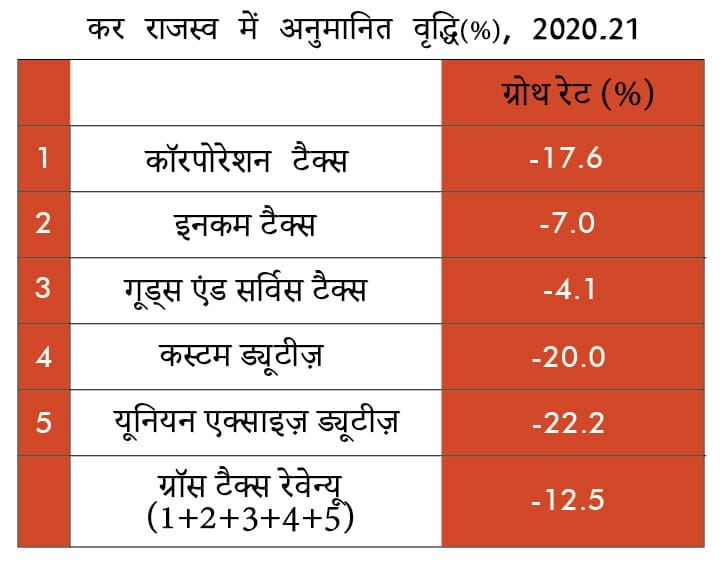 बजटीय अनुमान के मुताबिक, 2020-21 के लिए टैक्स से 16.3 लाख करोड़ रुपये की आमदनी का महत्वाकांक्षी लक्ष्य रखा गया था, जो कि पिछले साल के 15 लाख करोड़ के लक्ष्य से ज्यादा था. यह अनुमान कोविड के हमले से पहले इस आधार पर लगाया गया था कि जीडीपी में 10 प्रतिशत की वृद्धि हो सकती है. महामारी के हमले और देशव्यापी लॉकडाउन के कारण जीडीपी में सांकेतिक वृद्धि और टैक्स उगाही में गिरावट संभव है. हाल के एक दस्तावेज़ के मुताबिक 2020-21 के लिए टैक्स से आमदनी का हमारा अनुमान नीची वृद्धि दर पर आधारित है.