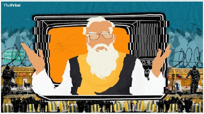 किसान आंदोलन ने मोदी सरकार के लिए प्रचार के स्तर पर एक नयी चुनौती खड़ी कर दी है. एक ‘चायवाला’ से लोक कल्याण मार्ग तक के उनके सफर को लेकर बड़े जतन से जो छवि गढ़ी गई थी वह धूमिल होने लगी है. हर दिन किसान आंदोलन में नये किसान आकर शामिल होते हैं और हर दिन उन पर नयी मीमे बनाई और प्रसारित की जा रही हैं—चाहे वह किसानों से वार्ता की अपील करते और फिर उनके आगे कांटे से भरी कुर्सी पेश करते मोदी या गृहमंत्री अमित शाह की हों, या ट्रैक्टरों से खदेड़े जा रहे मोदी की हों, या ‘मोदी नौकर अंबानी का’ शीर्षक से मीमें हो जिसमें मोदी को मुकेश अंबानी की खिदमत बजाते अलादीन के रूप में दिखाया गया हो, या जिनमें मोदी को सिंघू बॉर्डर पर बिछाई गईं कीलों को पानी से सींचते दिखाया गया हो.