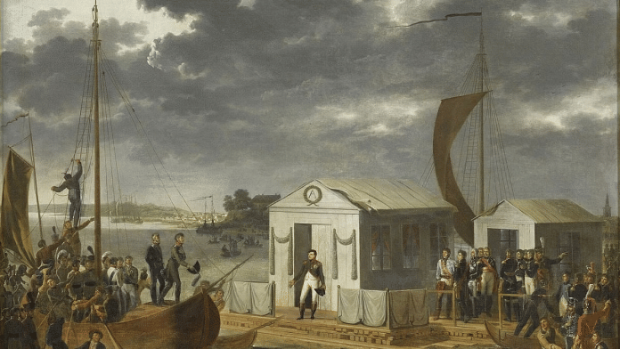 1807 की गर्मियों में सम्राट धीरे-धीरे नीमन नदी में नौकायन कर रहे थे: उन दरबारियों के लिए एक मार्गदर्शक के रूप में, जिन्होंने बहुत कठिनाई से जश्न मनाया था. शायद, उनके बार्ज पर बड़े सफेद तंबुओं को फ्रांस के सम्राट नेपोलियन बोनापार्ट के लिए ‘एन’ के साथ चिह्नित किया गया था और रूस के ज़ार अलेक्सांद्र पावलोविच के लिए ‘ए’. प्रशिया के राजा फ्रेडरिक विलियम III, जो युद्ध हार गए थे, को तंबू नहीं मिला और उन्हें नेपोलियन द्वारा अपनी पत्नी, मैक्लेनबर्ग-स्ट्रेलित्ज़ के साथ फ्लर्ट करते ही देखना पड़ा.