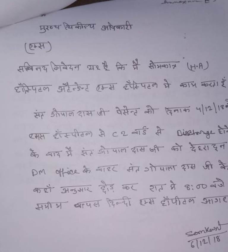 उस दिन एम्स की गाड़ी गोपाल दास को लेकर देहरादून पहुंची और कलेक्टर के घर के बाहर उन्हें छोड़ कर चली गई. गोपाल दास की नाक में ट्यूब लगी हुई थी, जिससे खून बह रहा था. कलेक्टर के घर के बाहर अकेले खड़े गोपाल दास ने अपने एक साथी को फोन किया, वे गोपाल दास को लेकर मैक्स अस्पताल पहुंचे जहां गोपाल दास की हालात देख कर मैक्स ने एमएलसी (मेडिको लीगल केस) बता इलाज करने से मना कर दिया. तब उनके साथी उन्हें लेकर दून अस्पताल पहुंचे और उन्हें एडमिट करा दिया. दून अस्पताल का रिकॉर्ड बताता है कि 5 दिसंबर रात 1.25 बजे उन्हें एडमिट किया गया.