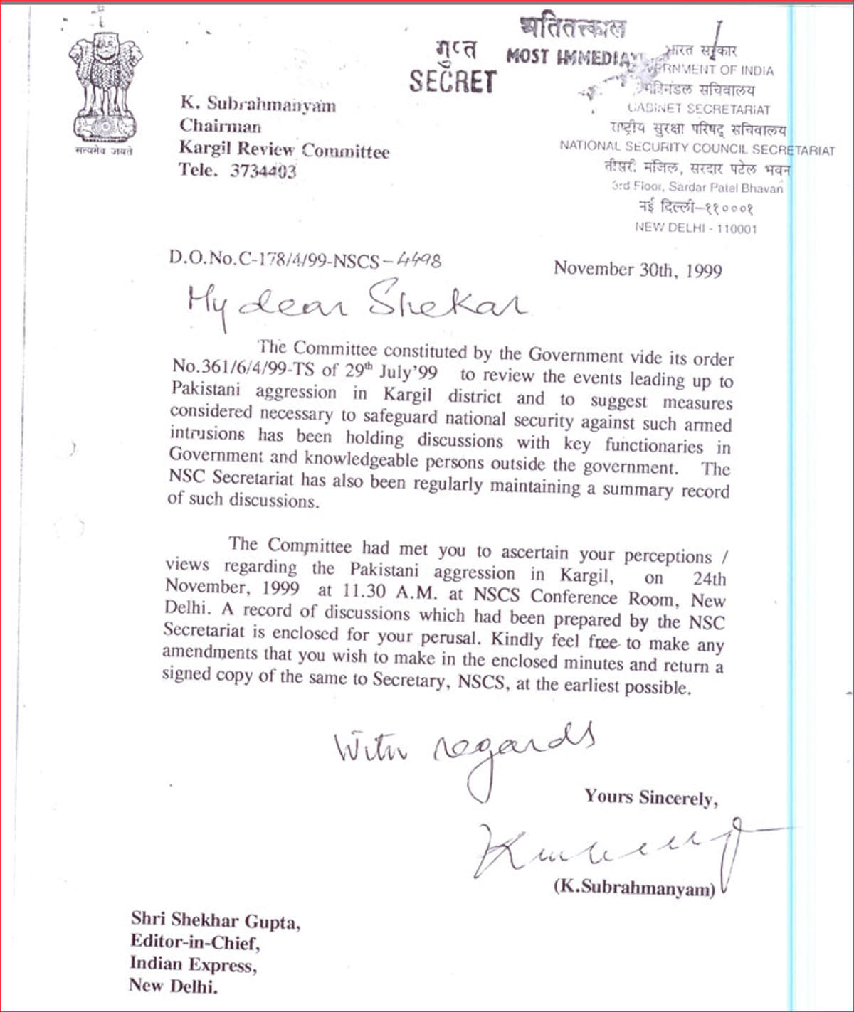 गुजरता हुआ समय मुझे इसे आगे ले जाने का कारण देता है। उस बयान के एक पखवाड़े के भीतर मुझे कारगिल समीक्षा समिति के चेयरमैन सुब्रमण्यम द्वारा हस्ताक्षर किया हुआ और “गुप्त” व “अतितत्काल” नाम से चिन्हित एक पत्र प्राप्त हुआ। मेरे अनुमोदन के लिए मेरे साथ हुई चर्चाओं का एक “रिकॉर्ड” संलग्न था। जानते हुए कि भारत सरकार कैसे काम करती है, मैं आश्चर्यचकित था कि यह इतनी जल्दी पहुंचा था लेकिन तब दूसरे छोर पर हमारे पास सुब्रमण्यम थे।