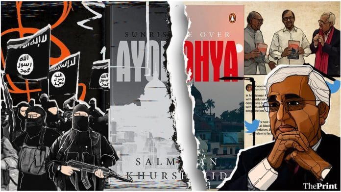 बहरहाल, खुर्शीद सुर्खियां बटोर रहे हैं. इतनी कि आपको उनकी किताब पढ़ने की भी जरूरत नहीं है. उसका नाम (‘सनराइज़ ओवर अयोध्या”) भी याद रखने की जरूरत नहीं है. इस पर बहस होगी, इस पर गौर किया जाएगा, यह इतिहास में दर्ज होगी, और शायद खरीदी भी जाएगी. मेरे ख्याल से सिर्फ इसमें की गई एक असावधानी भरी या अविवेकपूर्ण टिप्पणी की वजह से जिसमें राष्ट्रीय स्वयंसेवक संघ (आरएसएस) की तुलना आइएसआइएस या इस्लामिक स्टेट (डाएश) से की गई है. राहुल गांधी ने इस आग में घी डालने का काम किया है. जिस वीडियो में उन्होंने इस संदर्भ में बयान दिया है उसे देखकर लगता है किसी कार्डबोर्ड कंटेनर में शूट किया गया है. माफी चाहूंगा यह कहने के लिए मगर इस वीडियो की तस्वीर ऐसी है मानो इसे ग्वांतामो बे के किसी पूछताछ चैंबर में फिल्माया गया है.