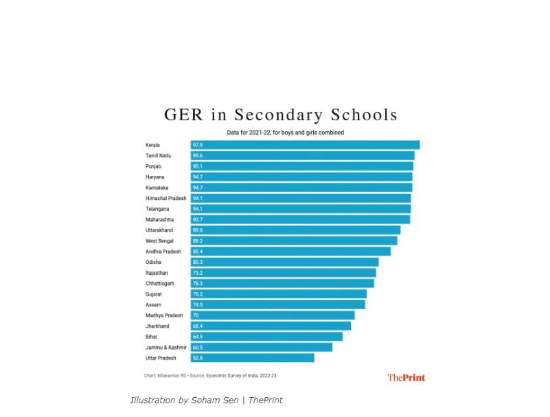 उत्तर प्रदेश में एक समस्या है. बड़े राज्यों में, देश में माध्यमिक विद्यालयों के लिए इसका ग्रॉस एनरोलमेंट रेशियो (सकल नामांकन अनुपात) सबसे कम है. और राज्य केवल केरल की तुलना में खराब प्रदर्शन नहीं कर रहा है, जहां इस स्तर पर लगभग सार्वभौमिक नामांकन दर है. 52.8 फीसदी के साथ यूपी का प्रदर्शन बिहार से 12 फीसदी ज्यादा खराब है. आज के समय में यह चौंकाने वाली बात है कि भारत के सबसे अधिक आबादी वाले राज्य में स्कूल जाने की उम्र में दो में से एक बच्चा स्कूल नहीं जा पाता है.