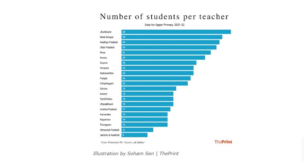 एक डेटा पॉइंट जो शिक्षा में निवेश की इस अतिरिक्त आवश्यकता को अहम बनाता है वह प्रति शिक्षक पर छात्रों की संख्या है. केरल या पश्चिम बंगाल जैसे उच्च जीईआर वाले राज्यों में प्रति शिक्षक छात्रों की संख्या अधिक होना एक बात है. वे पूरी क्षमता से काम कर रहे हैं, जबकि प्रजनन दर में गिरावट के कारण उनकी सेवाओं की मांग में सालाना कमी होने की संभावना है. लेकिन यूपी के मामले में कहानी बिल्कुल अलग है, जहां आधे बच्चे स्कूल भी नहीं जाते हैं और प्रजनन क्षमता अभी भी प्रतिस्थापन से ऊपर है. प्रति शिक्षक छात्रों (33) की अधिक संख्या इस बात की ओर इशारा करती है कि सिस्टम पहले से ही तेजी से चरमरा रहा है, जबकि मौजूदा क्षमता को पूरा करने के करीब भी नहीं है, बढ़ने की बात तो दूर है.
