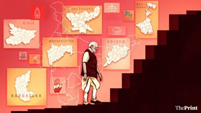 यह हमें छह प्रमुख राज्यों पर नज़र रखने के विचार पर वापस लाता है. ये छह राज्य कुल 193 लोकसभा सीटों का फैसला करते हैं. इनमें से चार (कर्नाटक, बिहार, महाराष्ट्र, झारखंड) उन 12 राज्यों में शामिल थे जिनमें मोदी ने 2019 में सफाया कर दिया था. अब इन चार राज्यों में मोदी के लिए नयी राजनीतिक चुनौतियां उभर आई हैं. बाकी दो राज्य (पश्चिम बंगाल और ओडिशा) उन्हें पहले ही तरह-तरह से चुनौती दे चुके हैं. इनके अलावा 100 और सीटें (तमिलनाडु, आंध्र प्रदेश, तेलंगाना, और केरल में) ऐसी हैं जो भाजपा की पहुंच से दूर ही हैं. 303 का आंकड़ा पार करने के लिए उसे इन छह राज्यों में और करीब 100 सीटें जीतनी पड़ेंगी.