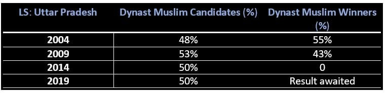 2004 के लोकसभा चुनाव में वंशवादी कनेक्शन वाले मुस्लिम उम्मीदवारों में से 58 प्रतिशत असल मुकाबले में रहे थे. 2009 में ऐसी मजबूत स्थिति में रहने वाले मुस्लिम उम्मीदवार 47 प्रतिशत, जबकि 2014 में 43 प्रतिशत रहे थे.