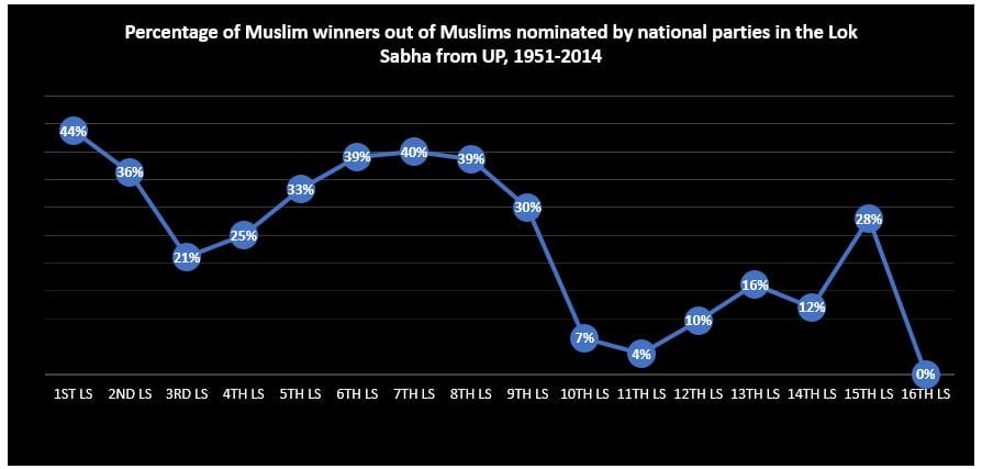 लोकसभा के 2004, 2009 और 2014 के चुनावों में उत्तर प्रदेश में (प्रमुख राजनीतिक दलों भाजपा, कांग्रेस, सपा, बसपा और रालोद के) मुस्लिम उम्मीदवारों का प्रतिशत क्रमश: 14 प्रतिशत, 11 प्रतिशत और 14 प्रतिशत था. सिर्फ 2014 को छोड़कर, जब राज्य के किसी भी मुस्लिम उम्मीदवार को जीत नसीब नहीं हुई थी. निर्वाचित सांसदों में मुसलमानों का प्रतिशत आमतौर पर उम्मीदवारों के अनुपात में ही हुआ करता था – जैसे, 2004 में 14 प्रतिशत और 2009 में 9 प्रतिशत.