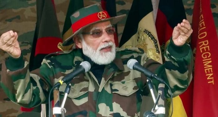 फौजी वर्दी में असैनिक नेताओं की जैसी छवि फबती है वैसी किसी दूसरी पोशाक में शायद ही फबती है. 2017 में डोकलाम में भारत-चीन टक्कर के बाद से प्रधानमंत्री नरेंद्र मोदी हर दीवाली पर फौजी वर्दी पहनते रहे हैं. इस साल दीवाली में भी उन्होंने जम्मू के रजौरी में नियंत्रण रेखा के करीब तैनात फ़ौजियों के साथ कुछ समय बिताया. उन्होंने छद्मावरण वाला फौजी जैकेट और लाल फीते वाला हैट पहन रखा था, जो कर्नल और उससे ऊपर के सेना अधिकारी पहनते हैं. उन्होंने हैट से लिपटे लाल फीते के बीच में भारतीय सेना का सजावटी प्रतीक चिह्न भी लगा रखा था. किसी रैंक का बैज नहीं लगाया था.