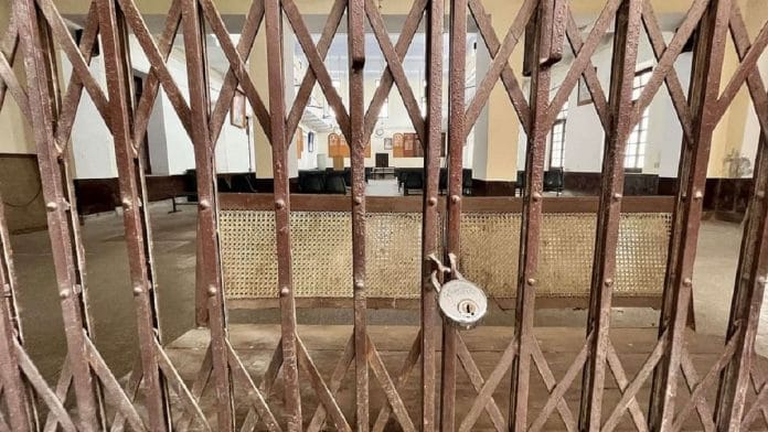 इलाहाबाद में छात्र संघ भवन का टूटा हुआ सामने का हिस्सा | फोटो: ज्योति यादव/दिप्रिंट