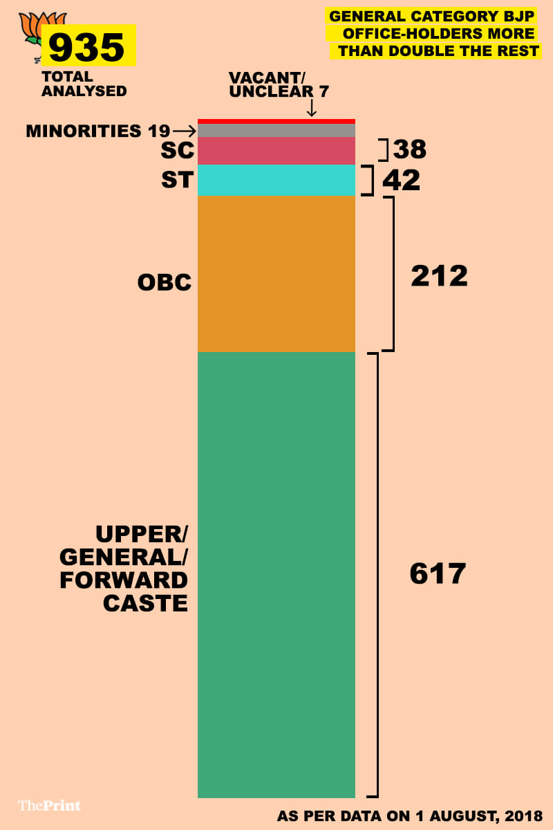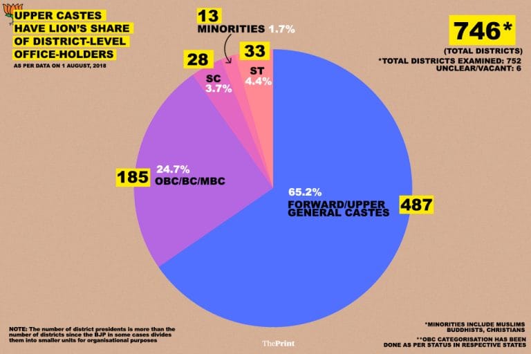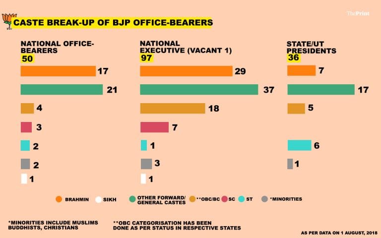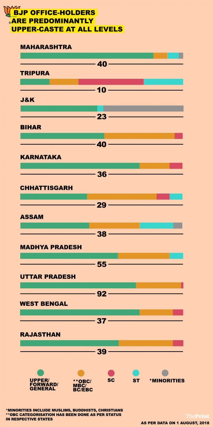 भाजपा के कास्ट प्रोफ़ाइल की सूक्ष्म जांच के बाद दिप्रिंट ने मालूम किया है कि पार्टी के राष्ट्रीय स्तर के पदाधिकारियों में तीन चौथाई ऊंची जाति से हैं। यही नहीं, भाजपा की राष्ट्रीय कार्यकारिणी का 60 प्रतिशत से भी बड़ा भाग जनरल कैटेगरी के लोगों से बना है।