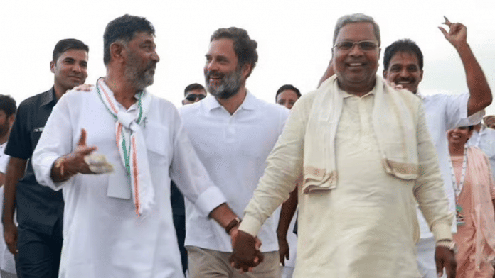 राहुल गांधी के साथ कर्नाटक कांग्रेस के नेताओं सिद्धारमैया और डी. के. शिवकुमार की एक एसयूवी स्पोर्ट्स तस्वीरें | फोटो: अबंतिका घोष | दिप्रिंट