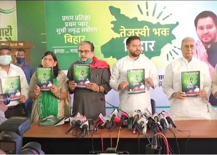 नई दिल्ली: बिहार विधानसभा के पहले फ़ेज़ की वोटिंग को महज तीन दिन रह गए हैं. सारी राजनैतिक पार्टियां मतदाताओं को लुभाने के लिए अपना विजन डॉक्यूमेंट जारी कर रही हैं. राष्ट्रीय जनता दल ने भी शनिवार को अपना चुनावी घोषणापत्र जारी कर दिया है. राजद ने अपने चुनावी घोषणापत्र बिहार की बेरोज़गारी को अहम मुद्दा बनाते हुए 10 लाख नौकरियां देने का वादा किया है. मेनिफेस्टो में किसान, युवा, रोजगार, महिला के साथ साथ पूरे बिहार के लिए कुछ न कुछ है.