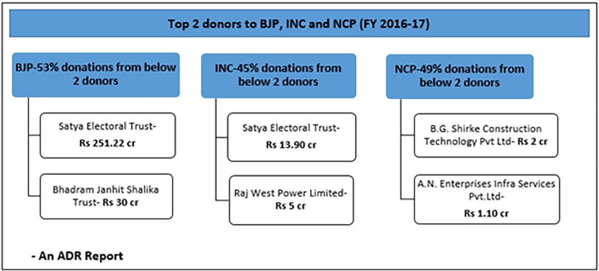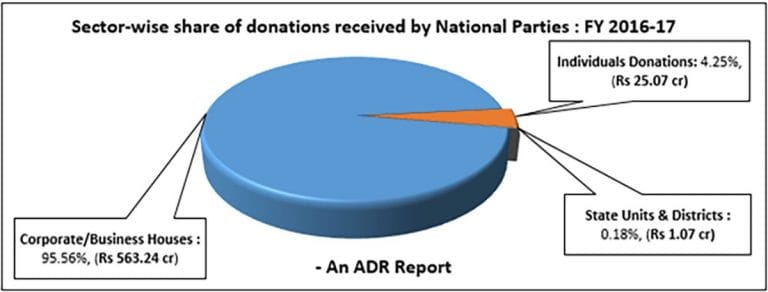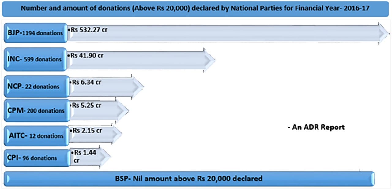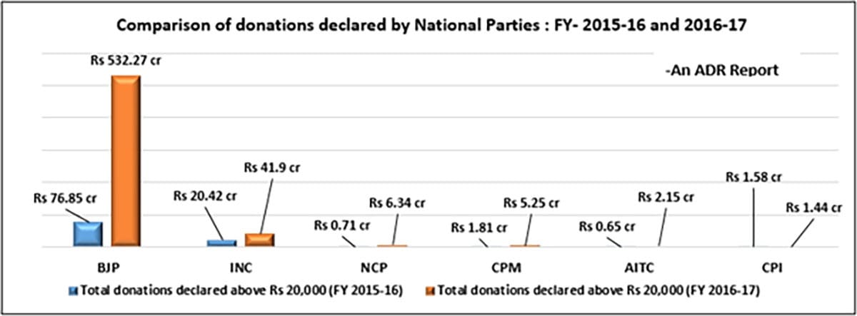 एसोसियेशन फॉर डेमोक्रेटिक रिफॉर्म्स (एडीआर) और न्यू इलेक्शन वाच की रिपोर्टें, 2016-17 में बीजेपी को मिलने वाले चंदे में एक बड़ी वृद्धि दर्शाती हैं। यह आंकड़ा कांग्रेस द्वारा घोषित राशि, जो कि सूची में दूसरे स्थान पर है, से 10 गुना अधिक है।