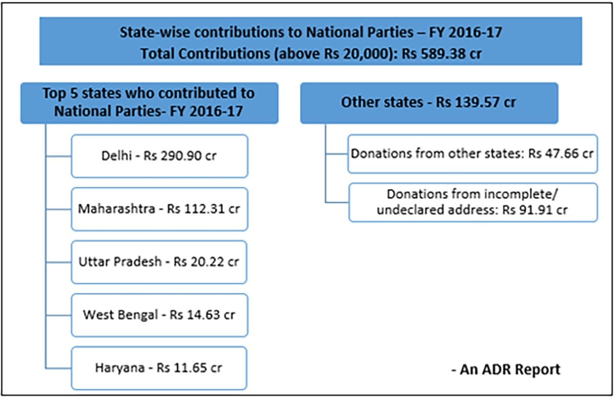 यह पाया गया कि 2016-17 में सभी पार्टियों द्वारा घोषित चंदे की राशि 589.38 करोड़ रुपये थी जबकि इसी अवधि में कुल आय 1559.17 करोड़ रुपये थी, जिसमें से 45.59 प्रतिशत चंदे की राशि अज्ञात स्रोतों से आई थी।