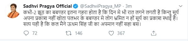 बता दें कि प्रज्ञा ठाकुर ने बुधवार को ही मच रहे हंगामें के बाद कहा था कि उनका ईशारा उधम सिंह की तरफ था न कि गोडसे की तरफ. डीएमके नेता ए राजा जब एसपीजी अमेंडमेंट बिल पर चर्चा के दौरान उधम सिंह पर अपनी बात रखी थी तब ठाकुर ने उन्हें बीच में टोकते हुए कहा था कि देशभक्तों का नाम मत लीजिए.
