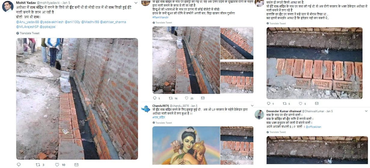 नई दिल्ली: श्रीराम नाम की ईंटों से बन रहे एक नाले की तस्वीर सोशल मीडिया पर खूब धूम मचा रही हैं. फोटो के साथ यह दावा किया जा रहा है कि ये ईंटें अयोध्या स्थित श्रीराम जन्मभूमि निर्माण स्थल से लाई गयी हैं.