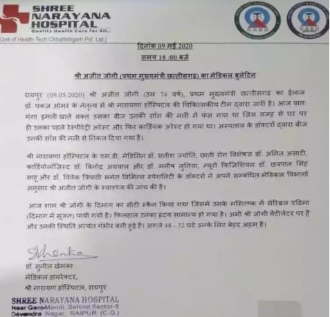 बुलेटिन में बताया गया है कि परिवार के सदस्यों ने जब अस्पताल को इसकी सूचना दी तब अस्पताल के चिकित्सक जोगी को देखने उनके निवास पहुंचे. चिकित्सक ने घर पर ही जोगी का इलाज शुरू किया और नारायणा अस्पताल लाकर उन्हें भर्ती कराया गया.