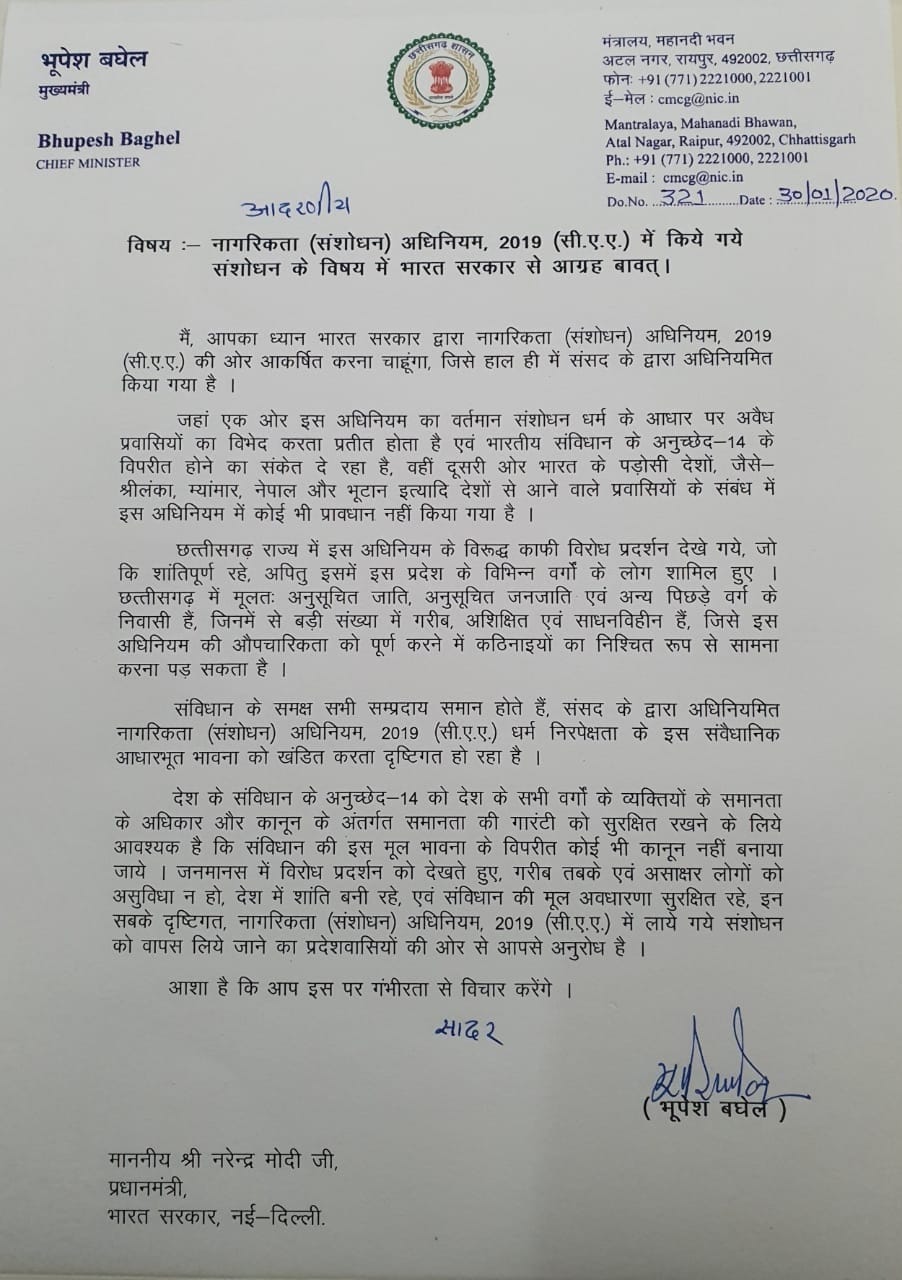बघेल द्वारा लिखे गए पत्र में कहा गया है कि जनमानस में विरोध प्रदर्शन को देखते हुए, गरीब तबके एवं अशिक्षित लोगों को असुविधा न हो, देश में शांति बनी रहे एवं संविधान की मूल अवधारणा सुरक्षित रहे. इन सबके दृष्टिगत, नागरिकता (संशोधन) अधिनियम, 2019 (सीएए) में लाये गये संशोधन को वापस लिया जाय.