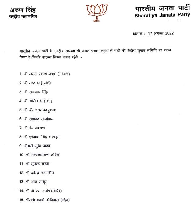 भाजपा ने पार्टी की केंद्रीय चुनाव समिति के सदस्यों की भी सूची जारी की. समिति में पीएम मोदी, जेपी नड्डा, अमित शाह, राजनाथ सिंह के अलावा बीएस येदियुरप्पा, के लक्ष्मण, इकबाल सिंह लालपुरा, सुधा यादव, सत्यनारायण जाटिया, भूपेंद्र यादव सहित महाराष्ट्र के उप मुख्यमंत्री देवेंद्र फडणवीस को शामिल किया गया. हालांकि इसमें ओम माथुर, बीएल संतोष और वनथी श्रीनिवास को जगह दी गई है.