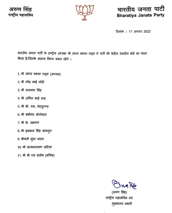 पार्टी अध्यक्ष जे पी नड्डा के अलावा प्रधानमंत्री नरेंद्र मोदी, केंद्रीय गृह मंत्री अमित शाह, रक्षा मंत्री राजनाथ सिंह और संगठन महामंत्री बीएल संतोष पहले से ही संसदीय बोर्ड के सदस्य हैं.