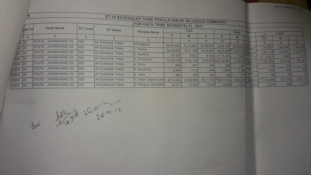 2018 में सूचना का अधिकार कानून के तहत अधिवक्ता दिप्ती होरो को झारखंड सरकार के गृह विभाग से मिली जानकारी के मुताबिक झारखंड में 86 लाख से अधिक आदिवासी हैं. इसमें सरना धर्म मानने वालों की संख्या 40,12,622 है. वहीं 32,45,856 आदिवासी हिन्दू धर्म मानते हैं. ईसाई धर्म मानने वालों की संख्या 13,38,175 है. इसी तरह से मुस्लिम 18,107, बौद्ध 2,946, सिख 984, जैन 381 आदिवासी इन धर्मों को मानने वाले हैं. वहीं 25,971 आदिवासी ऐसे हैं जो किसी भी धर्म को नहीं मानते हैं.