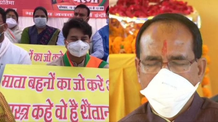 शहर के रीगल चौराहे पर महात्मा गांधी की आदमकद प्रतिमा के सामने सिंधिया के नेतृत्व में दिए गए इस धरने में इंदौर से लोकसभा सदस्य शंकर लालवानी, भाजपा के कुछ स्थानीय विधायक और अन्य वरिष्ठ नेता भी शामिल हुए.