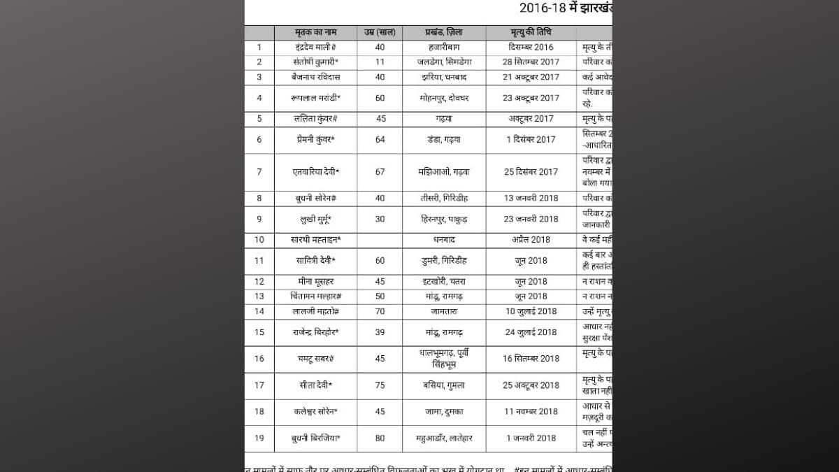 भूख से मौत के सरकारी आंकड़ों का स्क्रीनशॉट जिसमें 19 मौतों का जिक्र है.