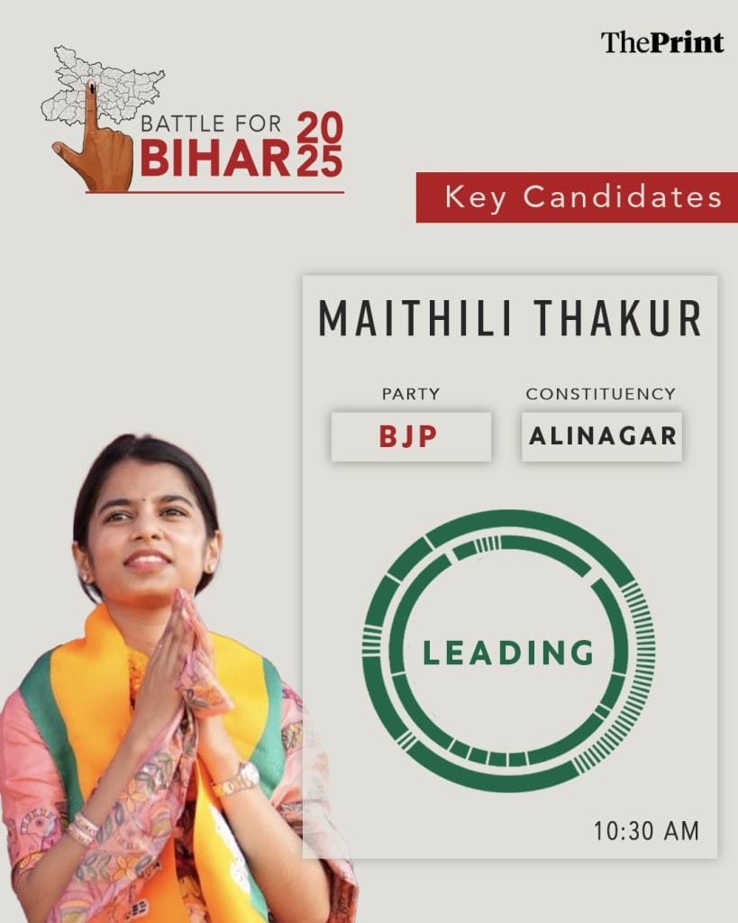 वहीं, अलीनगर से बीजेपी उम्मीदवार लोक गायिका मैथिली ठाकुर दो राउंड की गिनती के बाद आरजेडी के बिनोद मिश्रा के खिलाफ 3,004 वोटों की बढ़त बनाए हुए हैं. यह चुनाव 25 साल की मैथिली के राजनीतिक करियर की शुरुआत है.
