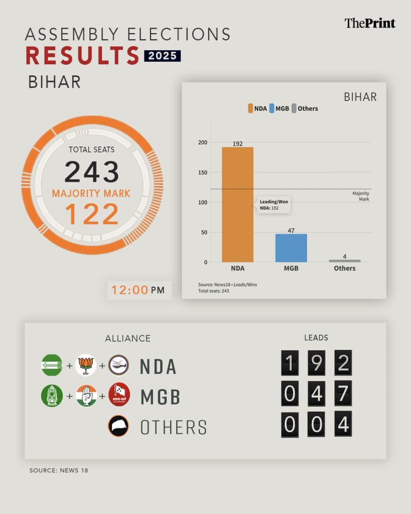 बिहार विधानसभा चुनावों में एनडीए की भव्य और अभूतपूर्व विजय ने बिहार प्रदेश ही नहीं बल्कि देश के चुनावी इतिहास में एक सुनहरा अध्याय लिख दिया है। यह विकास की राजनीति की एक ऐतिहासिक जीत है। इस बार के चुनावों में एनडीए को मिलने वाला तीन चौथाई बहुमत प्रधानमंत्री श्री @narendramodi के…