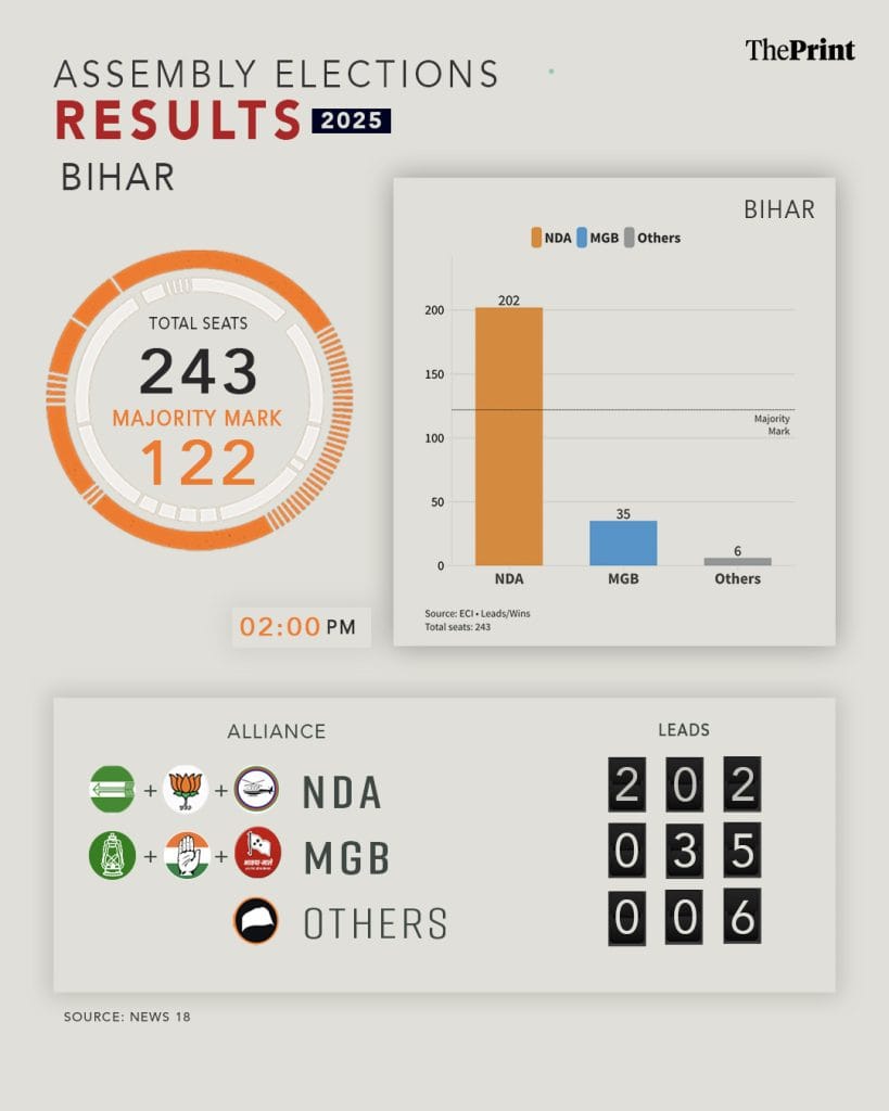 NDA मौजूदा रुझानों में बहुमत का आंकड़ा पार कर चुका है और दोपहर 2 बजे तक 202 सीटों पर आगे चल रहा है. वहीं महागठबंधन 35 सीटों पर आगे है.