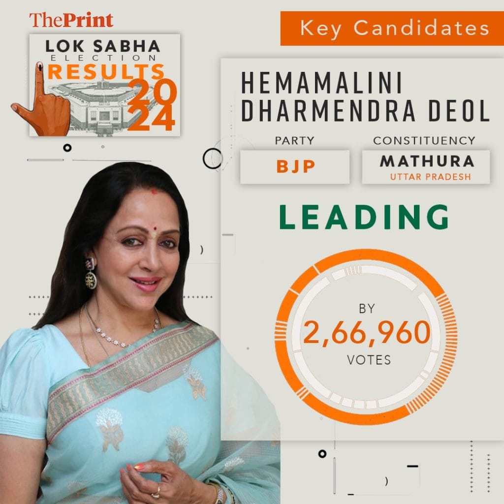 उत्तर प्रदेश की मथुरा लोकसभा सीट से तीसरी बार विजयी हुईं बीजेपी उम्मीदवार हेमा मालिनी