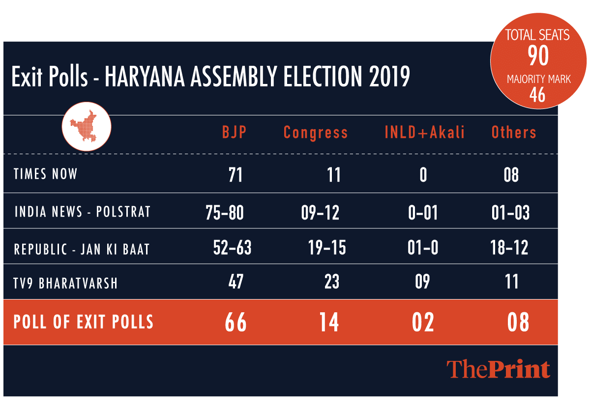 एग्जिट पोल के मुताबिक हरियाणा में मनो की सरकार बनने जा रही है. यानी हरियाणा की जनता ने मनोहर लाल खट्टर को ही अपना नेता माना है और 90 सीटों वाली विधानसभा में दो तिहाई बहुमत भाजपा को मिलने की उम्मीद जताई गई है.