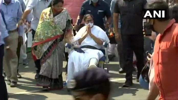ममता बनर्जी नंदीग्राम में चुनाव प्रचार के दौरान घायल होने के कुछ दिन बाद कोलकाता में तृणमूल कांग्रेस की चुनाव रैली में व्हीलचेयर पर पहुंचीं.