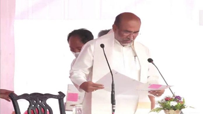 बीरेन सिंह के साथ नेमचा किपगेन, वाई. खेमचंद सिंह, बिस्वजीत सिंह, अवंगबौ न्यूमाई और गोविंदास कोंथौजम ने इंफाल में कैबिनेट मंत्रियों के रूप में शपथ ली.