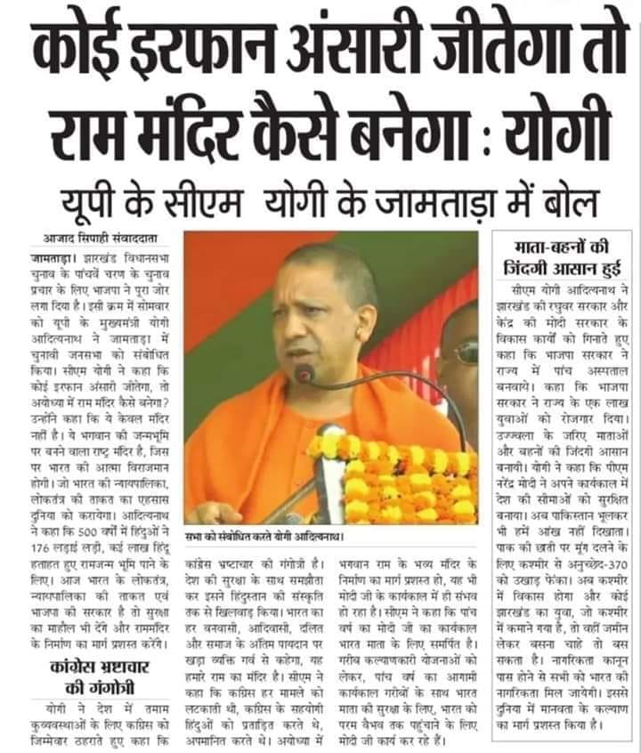 दूसरे राज्यों के नेताओं में बीजेपी की तरफ से सीएम योगी आदित्यनाथ और कांग्रेस की तरफ से छत्तीसगढ़ से सीएम भूपेश बघेल की जनसभाएं सबसे अधिक हुई हैं. योगी 16 दिसंबर को जामताड़ा के चुनावी सभा में कहा कि, ‘यहां से अगर इरफान (इरफान अंसारी जामताड़ा विधानसभा सीट से कांग्रेस के उम्मीदवार हैं) जीतेगा तो राम मंदिर कैसे बनेगा.’’
