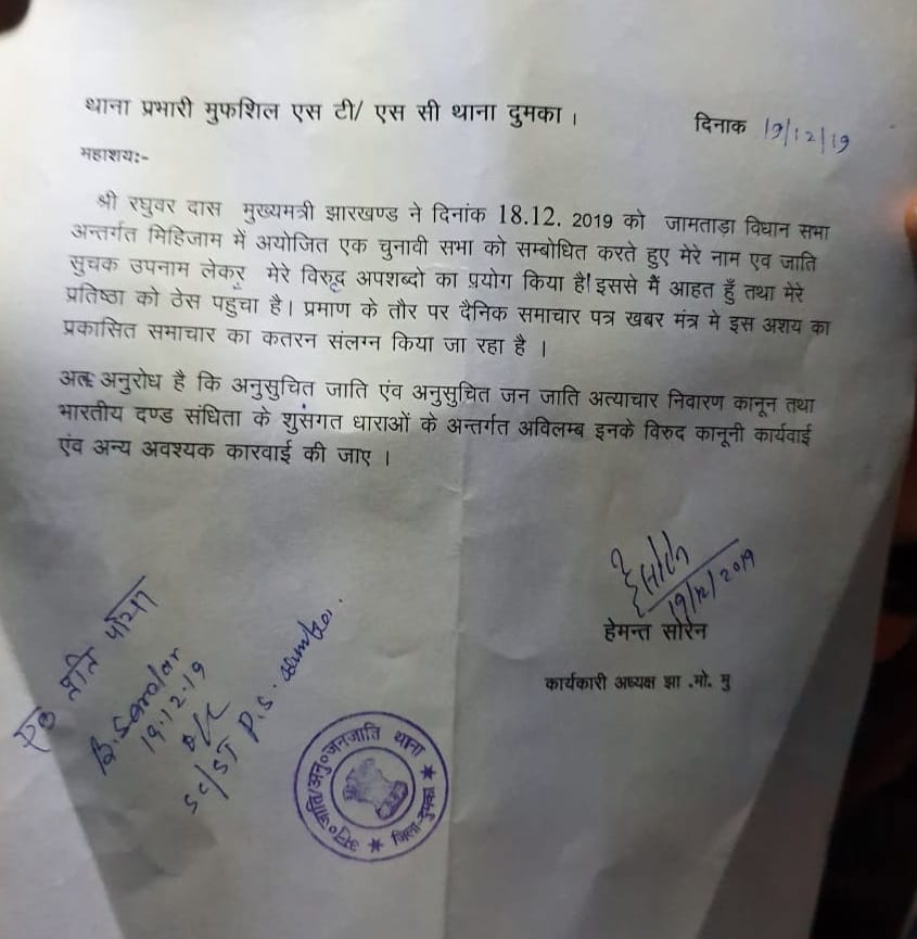 इसके बाद एसटी थाना दुमका में हेमंत सोरेन ने इस संबंध में शिकायत दर्ज कराई है. जिसमें उन्होंने कहा है कि रघुवर दास ने उनका उपनाम लेकर उनके खिलाफ जातिसूचक शब्द का प्रयोग किया है. अब देखनेवाली बात यह होगी कि चुनाव बाद भी आयोग इसपर किसी तरह का कोई कार्रवाई करती है या नहीं.