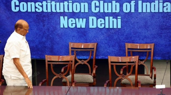 बुधवार को कॉन्स्टिट्यूशन क्लब ऑफ इंडिया, नई दिल्ली में विपक्ष की बैठक के बाद एक संवाददाता सम्मेलन में राकांपा नेता शरद पवार | फोटो: प्रवीण जैन | दिप्रिंट