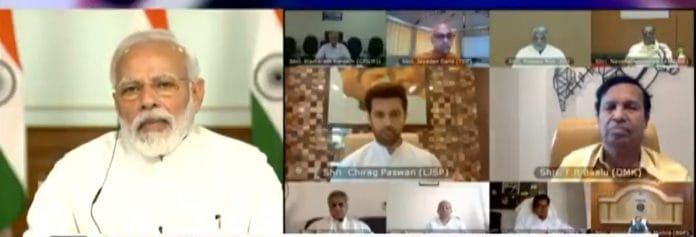 वीडियो कांफ्रेंसिंग के जरिए हुई इस बैठक में लोकसभा में कांग्रेस के नेता अधीर रंजन चौधरी, राज्यसभा में विपक्ष के नेता गुलाम नबी आजाद, राकांपा के शरद पवार, शिवसेना के संजय राउत के अलावा तृणमूल कांग्रेस के सुदीप बंदोपाध्याय, बसपा के सतीश चंद्र मिश्रा, द्रमुक के टी आर बालू, बीजद के पिनाकी मिश्रा, वाईएसआर के मिथुन रेड्डी, सपा के राम गोपाल यादव, जदयू के राजीव रंजन सिंह, लोजपा के चिराग पासवान, अकाली दल के सुखवीर सिंह बादल सहित कई अन्य दलों के नेता शामिल हुए. प्रधानमंत्री ने संसद के दोनों सदनों में उन दलों के नेताओं के साथ संवाद किया जिनके संसद में पांच से अधिक सांसद हैं.