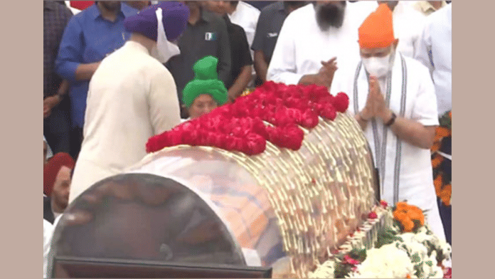 प्रधानमंत्री ने बादल के पार्थिव शरीर पर पुष्पांजलि अर्पित की और फिर शिअद प्रमुख सुखबीर सिंह बादल के बगल में बैठे. प्रधानमंत्री सुखबीर सिंह बादल का हाथ थामे शिअद प्रमुख के पिता के निधन पर दुख व्यक्त करते नजर आए.