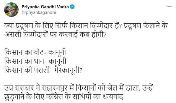 प्रियंका गांधी ने सहारनपुर में पराली जलाने पर किसानों के खिलाफ पुलिस कार्रवाई संबंधी खबर को लेकर भी भाजपा सरकार पर निशाना साथा.
